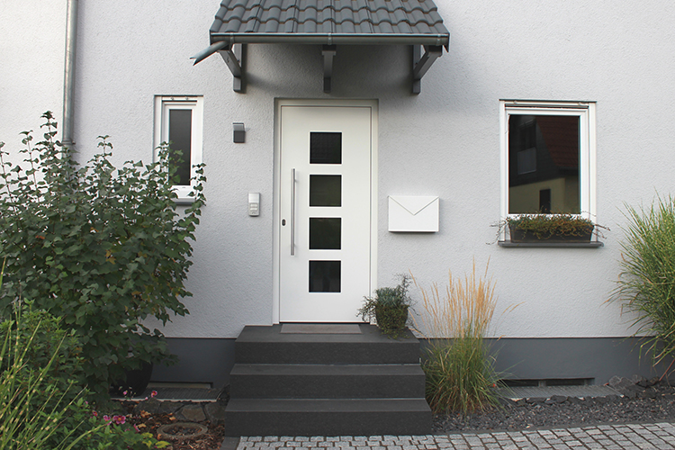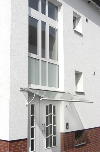 Produkt: Haustür in geschweißter Ausführung, PaXabsolut Kunststoff-Element, Vordach in Edelstahlrohrrahmenkonstruktion