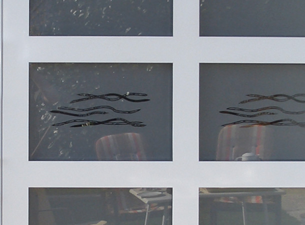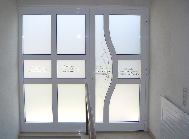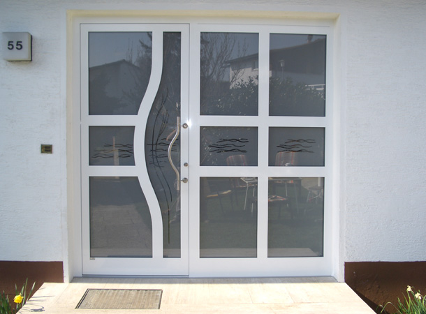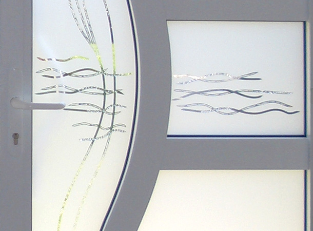 Oberfläche RAL 7012 basaltgrau, Wärmeschutzglas Ug 1,1 teilweise gestrahltes Glas mit umlaufend 40 mm klarem Rand , teilweise Ornamentglas Madras Uadi