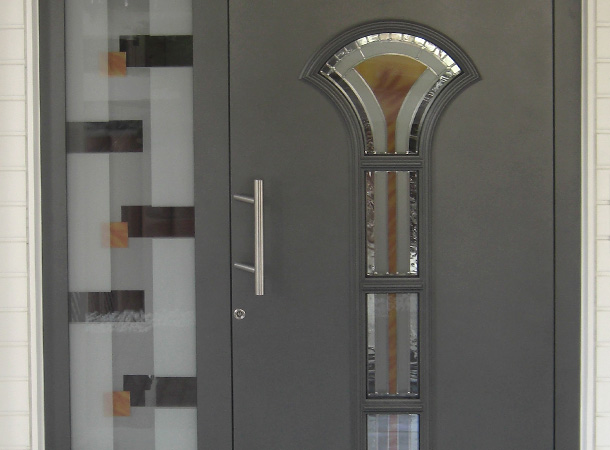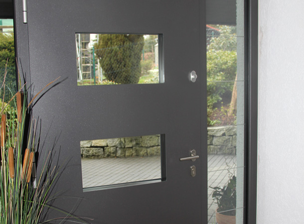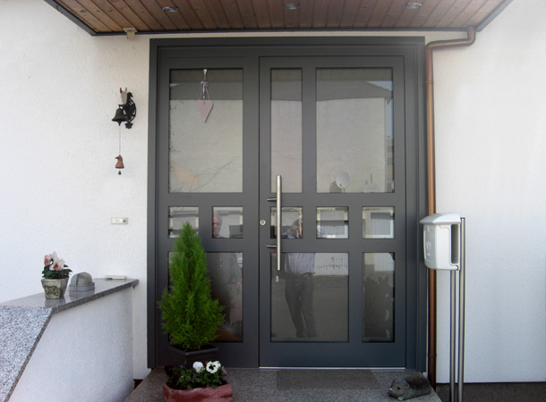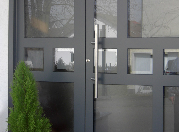 Aluminiumtüranlage Serie HEROAL 090S mit eingesetzter Füllung GRAUTE S1024 (Ral 7016) mit Edelstahlornamentrahmen, 7-fach Verriegelung,