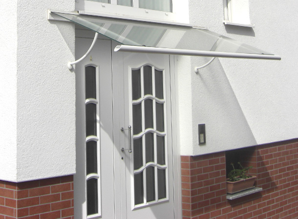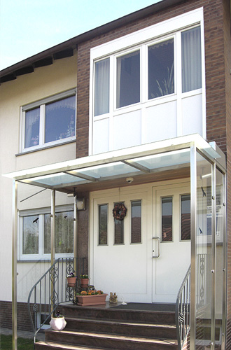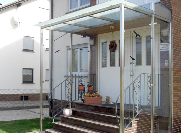 Vordachkonstruktion an vorhandenes Betondach nach eigener Planung, Überkopf- und Seitenverglasung (TVG und VSG)