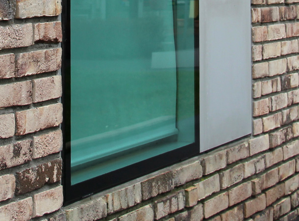 Fensterelement 2-teilig bestehend aus zweischaligen mit äußerer Festverglasung und innerem Revisionsflügel und einem Lüftungsflügel als geschlossenem Element incl. Sonnen/Blendschutz