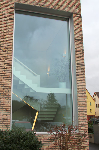 Besonderheiten: Große Treppenhausfenster-Verglasung mit einer Scheibe von 3 x 6 m (ohne Glasstoß)