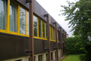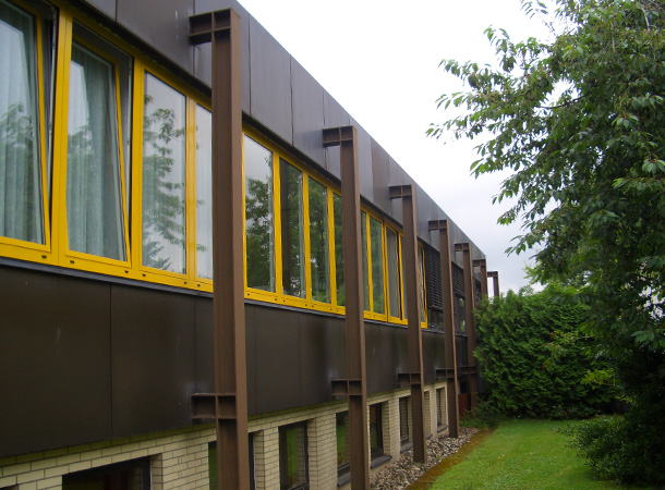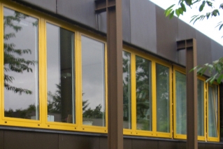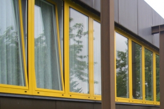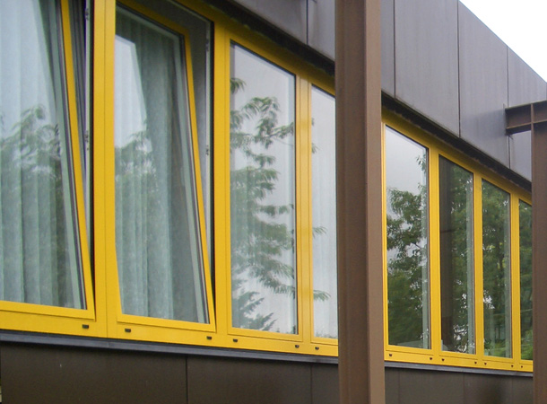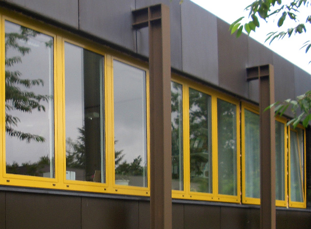 Fenster sind zweifarbig, Außen: RAL 1004 (goldgelb), Innen: RAL 9016 (verkehrsweiß), Profil: SCHÜCO AWS 70 Hi