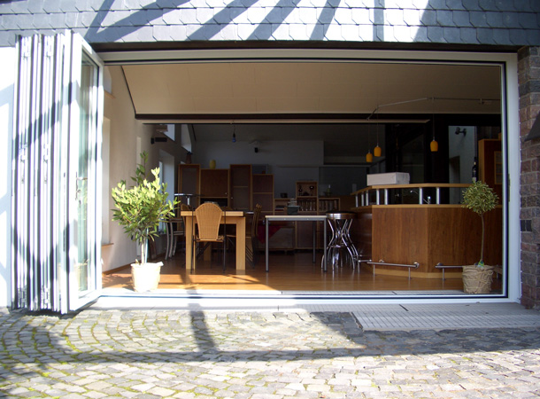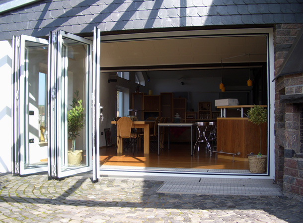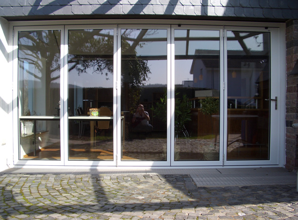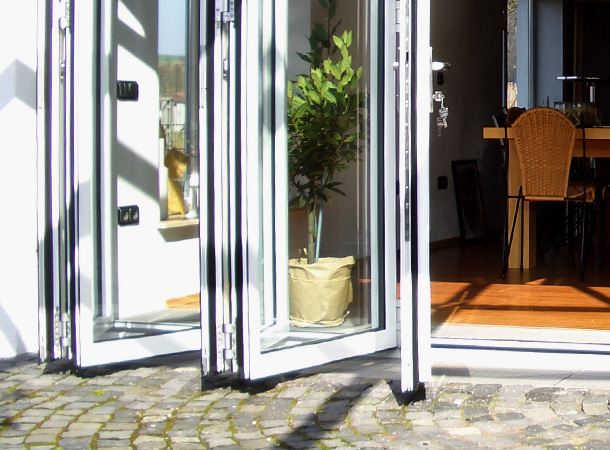 Ein-Raum-Gefühl bei geöffnetem Flügel, Flügel nach außen öffnend, versenktes Bodenprofil,